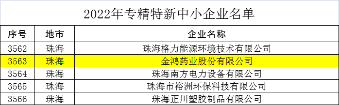 廣東省工業(yè)和信息化廳1月18日公布了2022年專(zhuān)精特新中小企業(yè)名單(已通過(guò)公示期),金鴻藥業(yè)股份有限公司被認(rèn)定為2022年廣東省專(zhuān)精特新中小企業(yè),位列3563號(hào)。